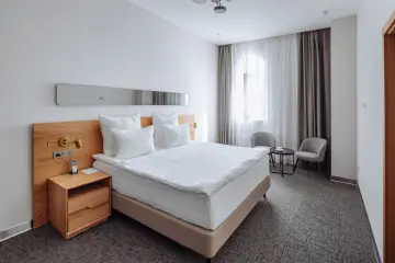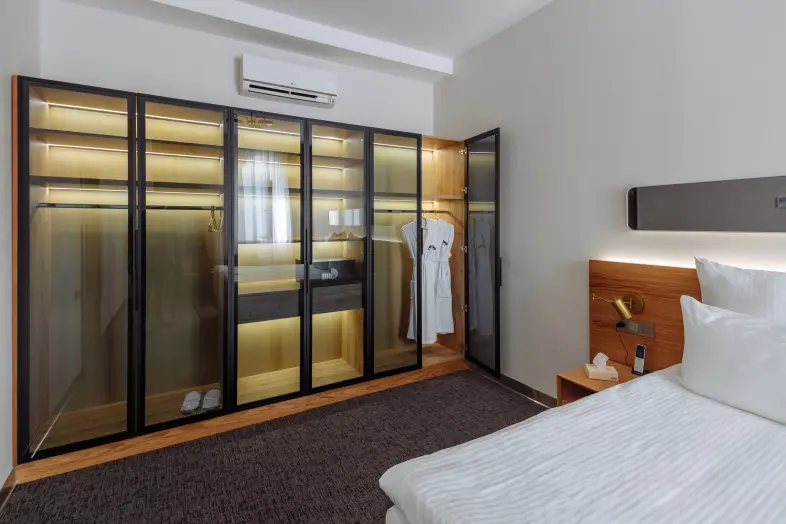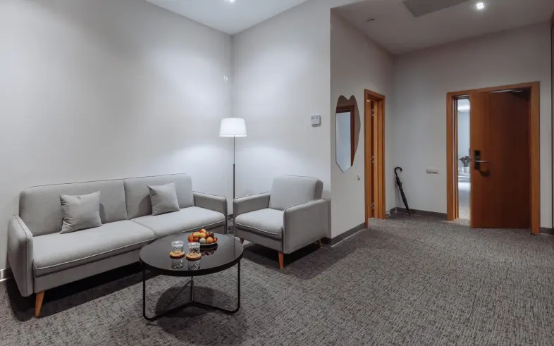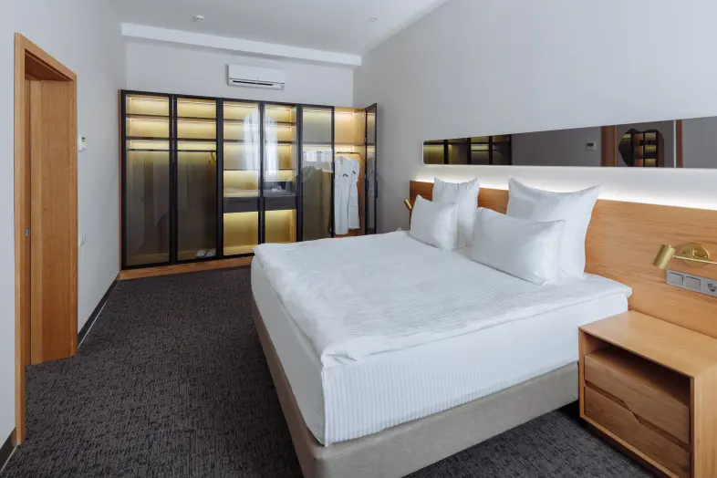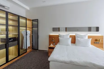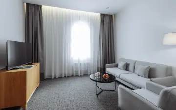This spacious Deluxe room includes a living room, a separate bedroom, and a bathroom with a shower. The room is equipped with air conditioning, soundproofing, a minibar, and a flat-screen TV with cable channels. Guests can enjoy a double bed and a sofa bed, as well as relax on their private balcony. The price is indicated for accommodation of one guests. The cost for a different number of guests is available upon request.