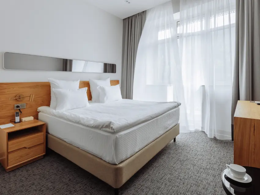 This comfortable double room offers the choice of two twin beds or one double bed. The bathroom features a shower, hairdryer, slippers, and toiletries. The air-conditioned room is equipped with a flat-screen TV with cable channels, soundproofing, and a minibar, with beautiful views from the window. It’s an excellent option for a relaxing stay. There are rooms available both with and without a balcony.